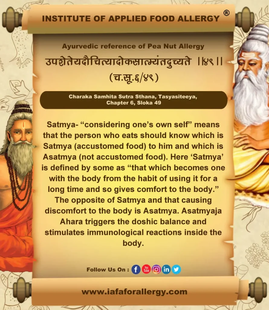 Ayurveda Science explains that an object which is not familiar to body cells and tissues is regarded as Asatmya or unwholesome and Satmya means suitability to some things, which are favorable for one’s own self. Asatmya may be also called Anupashaya or Ahita or Apathya. In other words, it can be said that the factor or particles which disrupt normal physiological functions or damage the dhatus is known as Asatmya. This concept may be correlated to all types of food allergies.