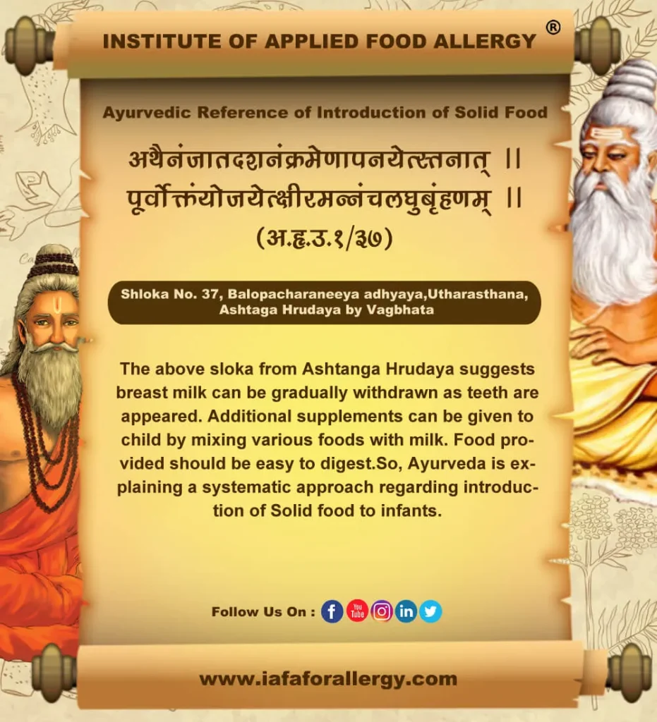 Ayurveda emphasizes breast milk should be given up to 6 months and all nutrients required for growth and development are enriched in breast milk. Beyond 6 months or as teeth starts to develop new food can be introduced by gradually withdrawing breast milk.