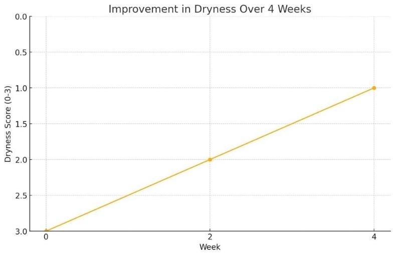 Dryness scores improved from grade 3 at baseline to grade 1 by week 4, reflecting improved scalp barrier and moisturization associated with external therapy. Y-axis showing Dryness (0–3) and X-axis showing Time (weeks).